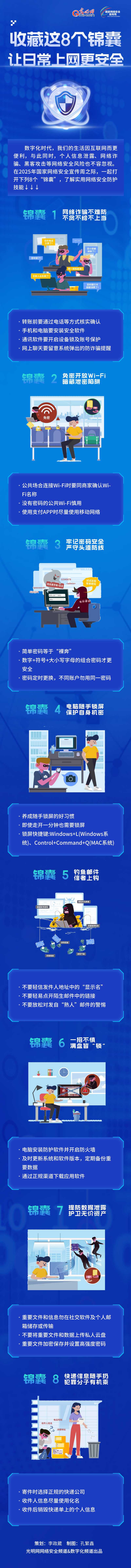 数字化时代,我们的生活因互联网而更便利,与此同时,个人信息泄露、网络诈骗、黑客攻击等风险也不容忽视。在2025年国家网络安全宣传周之际,一起打开8个“锦囊”,了解实用网络安全防护技能↓↓↓